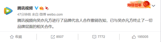 腾讯视频刚刚发微,腾讯视频向吴亦凡方进行了品牌代言人合作撤销告知,已与吴亦凡方终止了一切品牌层面的相关合作。