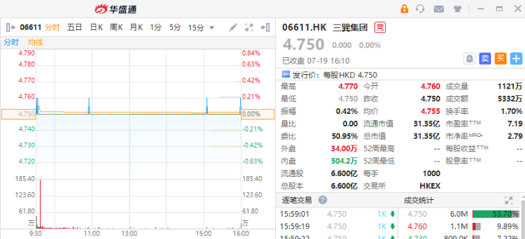 华盛资讯7月19日讯,地产开发商-三巽集团(06611.HK)首挂平收,报4.75港币,全日成交额5332万港币,最新总市值超31亿港元。