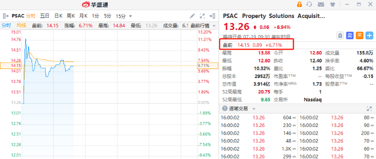 华盛资讯7月19日讯,美股盘前,截至发稿,PSAC盘前涨超6%,报14.15美元,该股于上一个交易日收涨6.94%。其打造的FF91量产版开启预订,需支付5万元定金。
