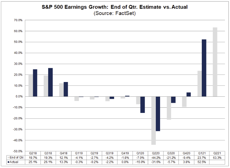 过去几个月,分析师们纷纷上调标普500指数的盈利预期,创下了历史新高。根据Factset预测,如果标普500指数第二季度盈利同比增长69.3%,这将是该指数自2009年第四季度(109.1%)以来的最高盈利同比增长率。