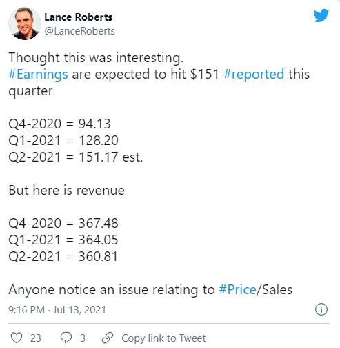 尽管出现了“史上最强劲的盈利复苏”,但市场估值仍在继续扩大。(下图使用的是对2021年第二季度的当前预测)说到这里,股价追上了盈利。