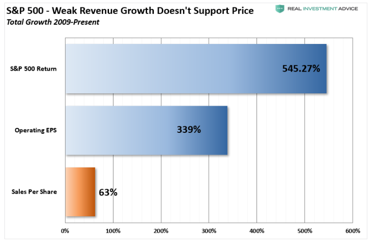 “盈利能力”的增长主要来自于各种成本削减措施和会计噱头,而不是营收的实际增长。虽然减税肯定为股票回购激增提供了资本,但以消费为基础的经济导致的收入增长仍不明显。