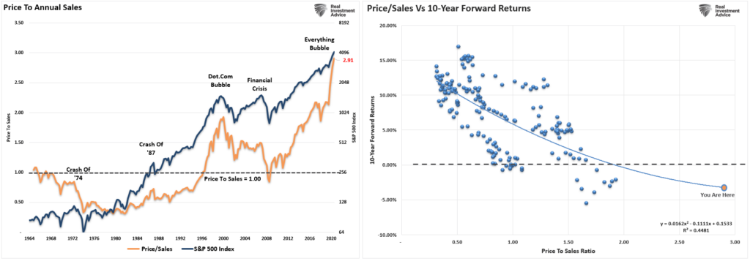 问题是,由于美联不断注入流动性,股市大幅走高。虽然市场流动性会推高资产价格,但它不会促进经济活动,而经济活动会创造企业收入。目前来看,价格与销售比率(PSR)达到了历史最高水平。如上图所示,历史相关性表明,投资者的结果并不乐观。