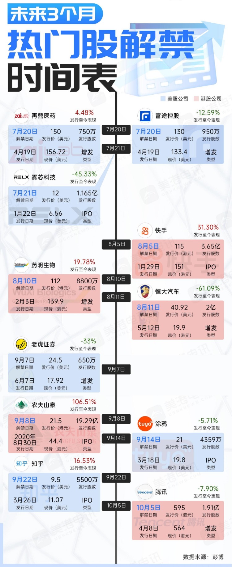 未来三个月,价值约387亿美元的中国科技股迎来解禁,涉及35只个股,包括腾讯、美团(03690)、快手(01024)、雾芯科技(RLX)等,解禁日期临近往往股票波动性加大,且有下跌风险。