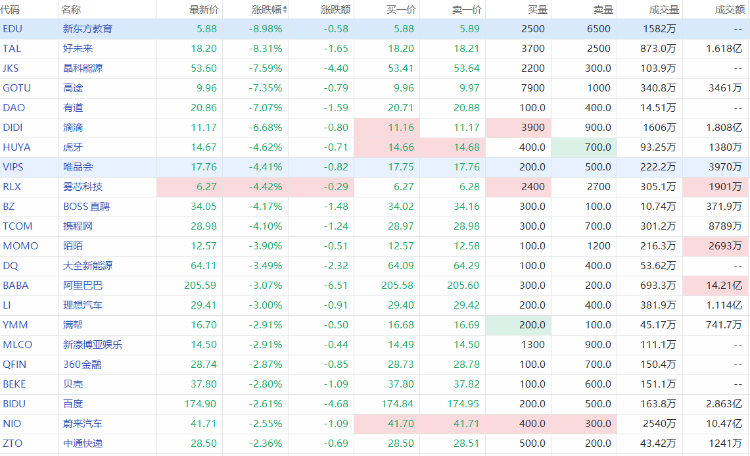 截至发稿,教育股领跌板块,新东方教育(EDU)、好未来(TAL)跌超8%、高途(GOTU)、有道(DAO)跌超7%、滴滴(DIDI)跌超6%;