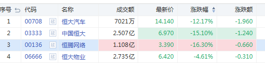 7月20日消息,昨日恒大系集体重挫,昨日收盘,恒大汽车跌19.10%,中国恒大跌超16%,恒大物业跌超13%,恒腾网络跌11.76%。今日开盘,恒大系涨跌不一,盘初跌幅扩大。截至发稿,中国恒大跌15%,跌破千亿市值,恒大汽车跌12%,恒大物业跌4%,恒腾网络跌16%。