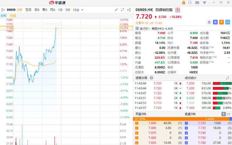 华盛资讯7月20日消息,百得利控股盘中获急速拉升,现涨10.29%,报7.72港元每股,最新总市值46.32亿港元,该股已较发行价4.4港元涨超70%。