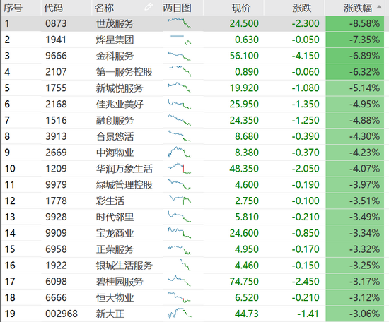 物业股跟随内房股大幅回调,世茂服务跌超8%,金科服务、第一服务跌超6%,新城悦、佳兆业美好、融创服务跌5%,合景悠活、中海物业、华润万象等跌超3%。