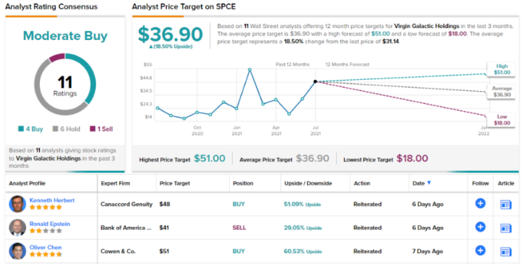 图表显示,华尔街分析师对维珍银河给出了不同的评级;基于4个“买入”评级、6个“持有”评级和1个“卖出”评级,SPCE共识评级为“适度买入”。平均目标价为36.90美元,意味着未来12个月的上涨空间为13.9%。
