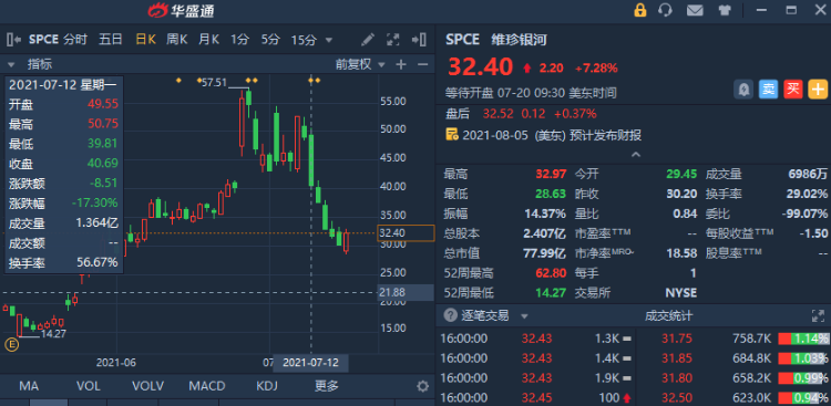 公司创办人兼董事长Richard Branson在完成历史性的太空之旅后,维珍银河(SPCE)的股价急速下行。在上周的交易日中,该股共暴跌了38%。