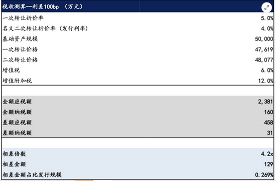 根据初步测算,采用“全额纳税”和“差额纳税”的差额大约相当于 ABS/ABN 发行规模的0.269%。