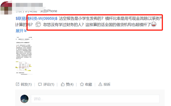 对于这份沽空报告,有雪球用户表示,“沽空报告是小学生发佈的?槓杆比率是用毛现金流除以淨资产计算的吗?忽悠沒有学过财务的人?”