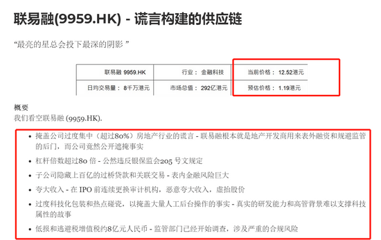 沽空机构认为,在光鲜的外表下,联易融只不过是一个被美化的房地产贷款经纪,依靠大量人工劳动力而不是人工智能来完成这项工作。该公司一直通过夸大收入来误导投资者,并就其深度涉足被严控的房地产领域的程度和占比数据上公然撒谎。