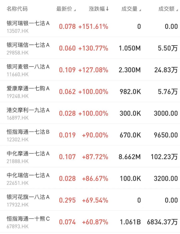其中,窝轮总成交108.88亿港元,牛熊证总成交72.73亿港元。