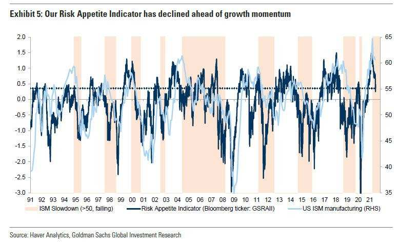 3. 然而,最近周期性和价值领涨不仅消退,而且在很大程度上逆转了。有很多推动因素,包括美国增长势头放缓、疫情变异等,都引发了人们对全球增长势头丧失的担忧。而美联储点阵图的变化增加了人们对过早收紧政策可能导致的政策错误的关注。这些担忧反映在高盛的风险偏好指标(GSRAII)的回落上,这也与制造业供应管理协会(ISM)对未来几个月经济增速显著放缓的预期一致(表5)。