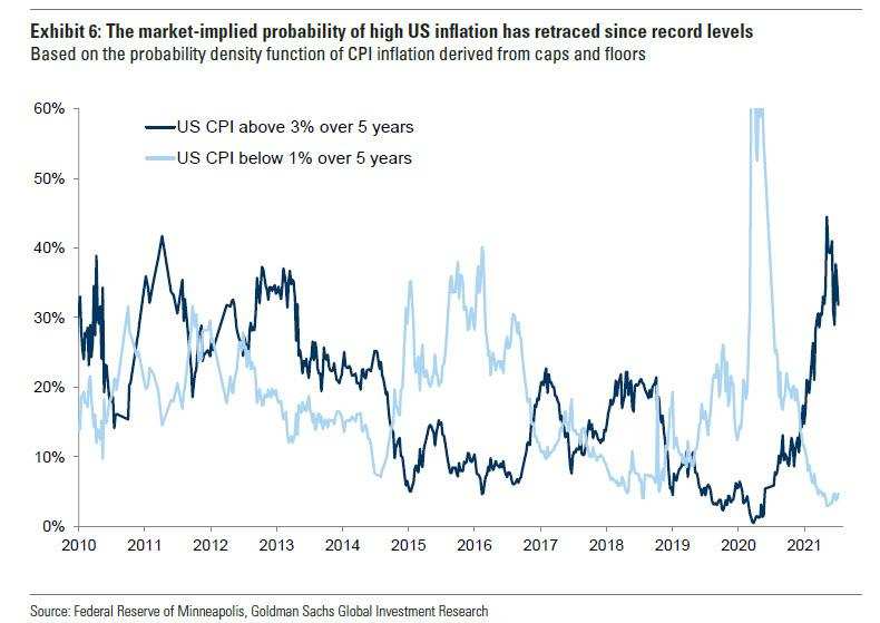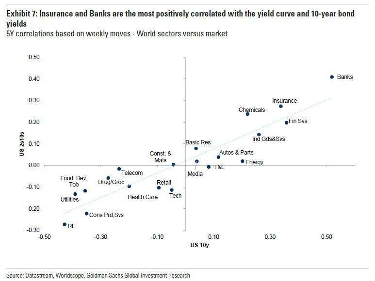 5. 通胀预期、债券收益率和收益率曲线的斜率可能会对行业相对回报产生重大影响,尤其是在人们认为的周期转折点。银行、基础资源、能源、汽车等经典价值领域的收益与美债收益率曲线斜率,以及与美国10年期债券收益率的正相关性最高。过去几周,美债收益率大幅下跌,打击了这些板块的相对回报率,这是可以理解的。但高盛的债券策略师仍然认为,这些收益率走势超出了基本面。