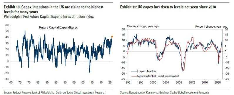 除此之外,随着时间的推移,领涨股的集中度将会减少。在不同行业和地区,成为市场领涨者的机会开始变得更加多样化。科技正在成为所有行业中更重要的组成部分,而环保领域的转变,正在增强那些长期表现不佳的市场领域的增长机会。美国的资本支出意图正上升到多年来的最高水平,这与高盛的资本支出跟踪数据相符。