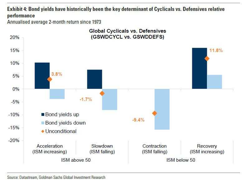 尽管在ISM收缩的时期,对于周期性指数来说一直是负面的,对于防御性指数来说是正面的,但复苏阶段基本上是相反的。无论债券收益率如何变化,这都是事实。增长阶段与ISM指数高于50且正在放缓的时期大致一致,但在哪些板块领涨方面则要模糊得多,而且在很大程度上取决于债券收益率是在上升还是在下降。