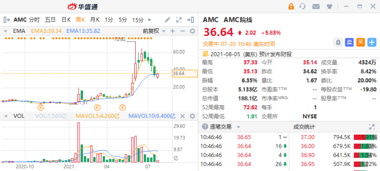 AMC院线今日股价走高,现涨幅为5.83%,报36.64美元。