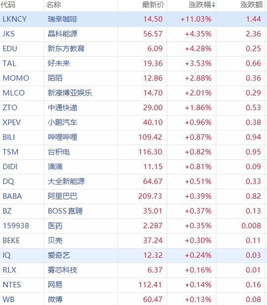 截至发稿,瑞幸咖啡涨11.03%,晶科能源涨4.35%;教育板块涨跌不一,新东方教育涨4.28%,好未来涨3.53%,有道跌1.99%,高途跌0.20%;陌陌、新濠博亚娱乐均涨超2%。