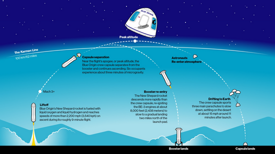 在Blue Origin的New Shepard火箭发射大约10分钟后,太空舱于当地时间08:22左右降落在西德克萨斯。飞船飞过海拔约100公里高度的卡门线,船员经历了片刻失重状态。接着,太空舱在降落伞作用下返回。