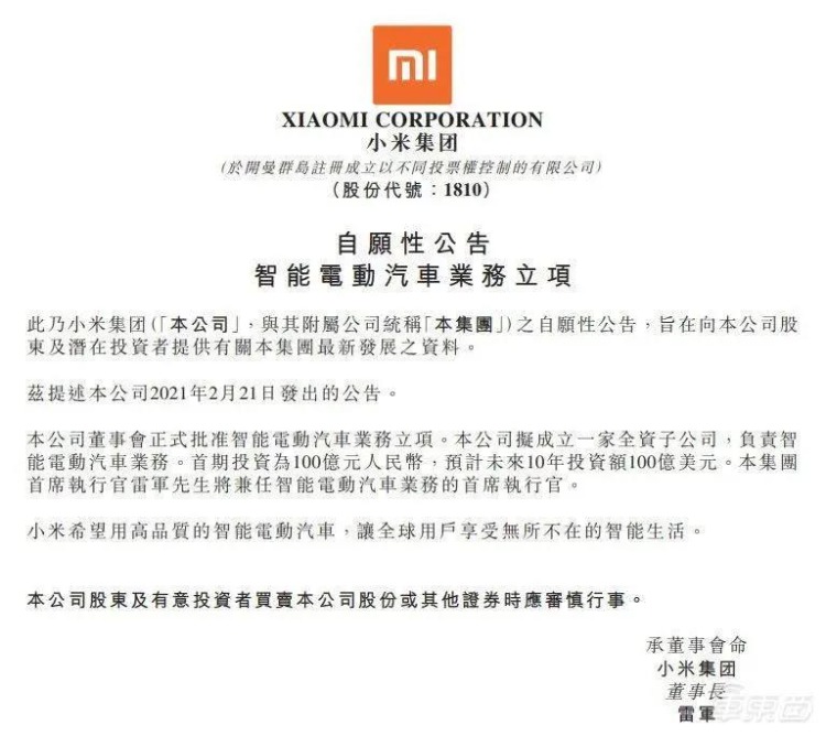 终于在今年3月30日下午,小米集团官方发布了一则公告显示公司董事会已经正式批准智能电动汽车业务立项,将成立智能电动汽车业务的全资子公司,首期投入100亿元人民币,预计未来10年投资额达到100亿美元(约合人民币647亿元)。