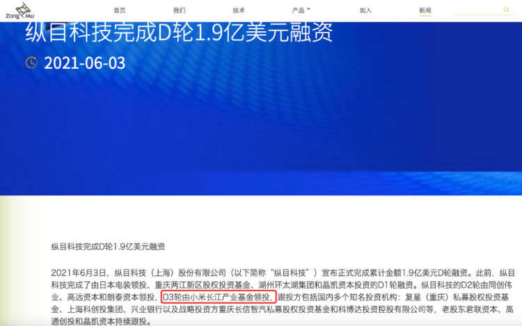6月3日,小米旗下长江产业基金领投了纵目科技的D3轮融资,纵目科技也成为了小米宣布造车后投资的首个汽车领域的企业。