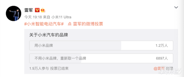 ”而在品牌方面,雷军也在微博上发起了投票调查,共有1.9万名网友投票,投票结果显示,有1.2万人希望小米继续使用“小米”作为汽车品牌,6897人希望重新成立品牌造车。