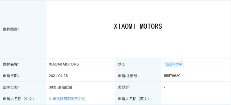 在4月26日,小米汽车又申请了多个汽车方面的商标,分别为“XIAOMI MOTORS”、“XIAOMI AUTO”、“MIMOTORS”、“MIAUTO”,国际分类设计运输贮藏、广告销售、运输工具等,目前商标状态均为“注册申请中”。