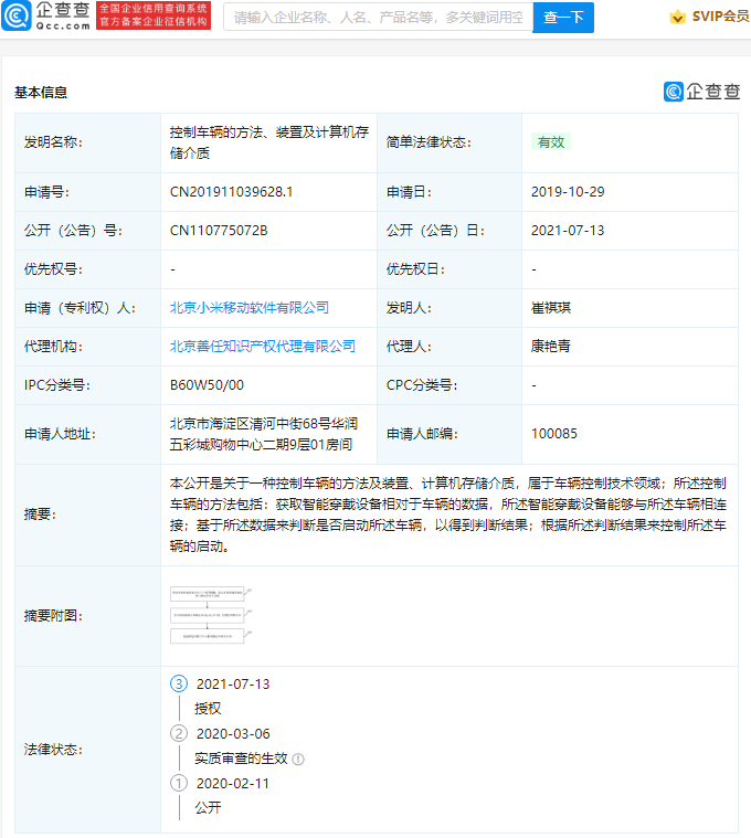 7月13日,小米公司的“控制车辆的方法、装置及计算机存储介质”专利获授权,这项专利可以获取智能穿戴设备相对于车辆的数据,所述智能穿戴设备能够与所述车辆相连接;基于所述数据来判断是否启动所述车辆,以得到判断结果;根据所述判断结果来控制所述车辆的启动。