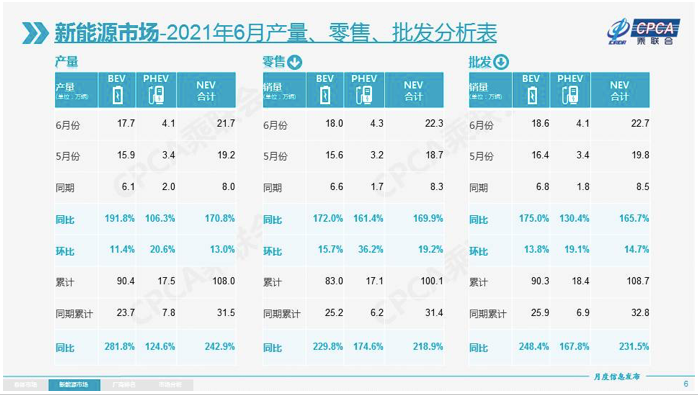 乘联会数据显示,今年前半年国内新能源乘用车的批发量为108.7万辆,同比增长了231.5%,零售销量则为100.1万辆,同比增长218.9%。