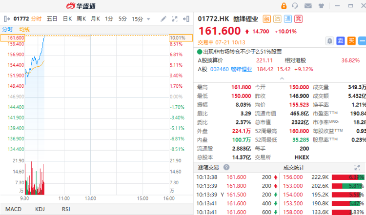 华盛资讯7月21日消息,赣锋锂业今日持续强势上涨,截至发稿,该股涨10.01%,现报161.6港元每股,最新总市值2322亿港元,股价较今年最低点已翻倍。