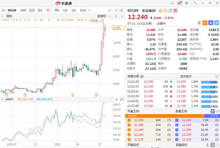 华盛资讯7月21日消息,东岳集团早盘拉升走高,截止发稿,现涨7.37%,报12.24港元每股,总市值258.4亿港元,成交额3.818亿港元。