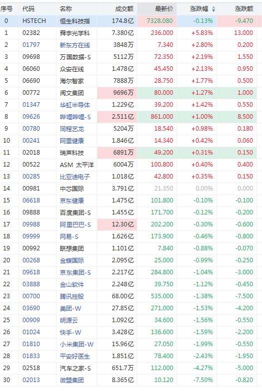 舜宇光学科技涨5%;新东方在线、众安在线、万国数据-SW涨超2%;海尔智家、华虹半导体、阅文集团涨超1%。