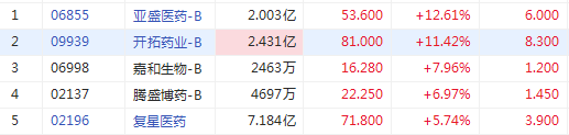 抗疫概念股早盘走高,截至发稿,复星医药(02196)涨5.74%,报71.8港元;开拓药业-B(09939)涨11.42%,报81港元;腾盛博药-B(02137)涨6.97%,报22.25港元。