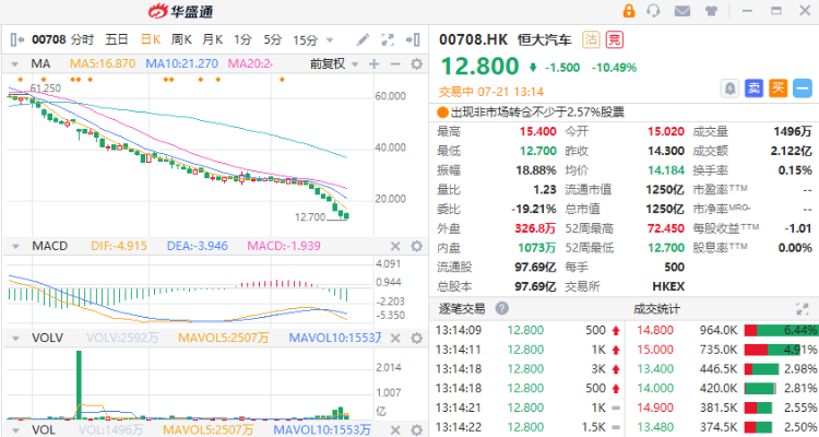 华盛资讯7月21日消息,恒大汽车午后继续下挫,现跌幅扩大至10.49%,报12.8港元每股,暂成交2.122亿港元,最新总市值1250亿港元。该股连续8日下跌,市值蒸发近1500亿,股价刷新自一年以来新低。
