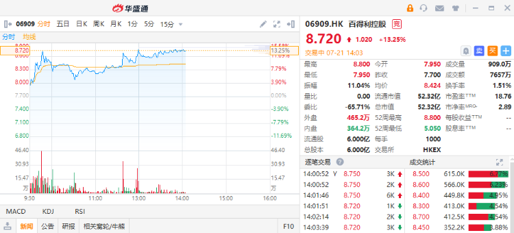 华盛资讯7月21日消息,百得利控股近日持续强势上涨,截止发稿,百得利控股上涨13.25%,现报每股8.72港元,总市值52.32亿港元,较发行价4.40港元上涨超98%。该股7月15日正式上市。