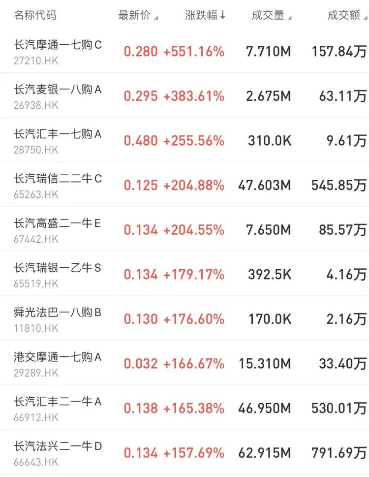 涨幅居前的包括: 长汽摩通一七购C暴涨551.16%,占据排行榜第一,长汽麦银一八购A 383.61%;长汽汇丰一七购A涨255.56%。值得注意的是,今日,长城汽车9只牛证涨超100%。
