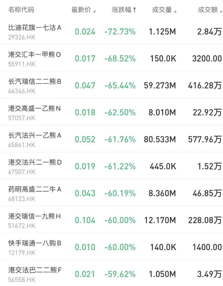 在今日跌幅榜中,比迪花旗一七沽A跌72.73%;港交汇丰一甲熊O跌68.52%。