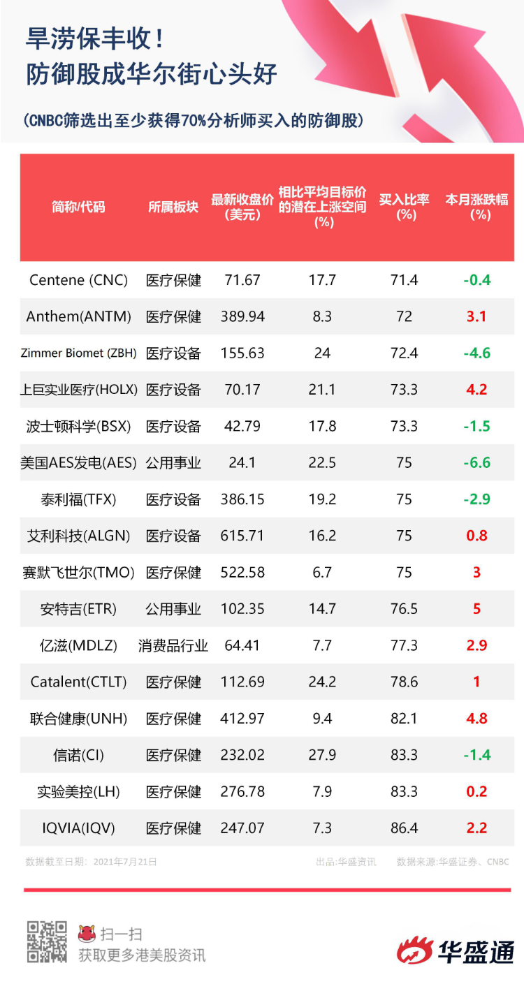 以下就是CNBC Pro筛选出的备受华尔街青睐的防御股名单: