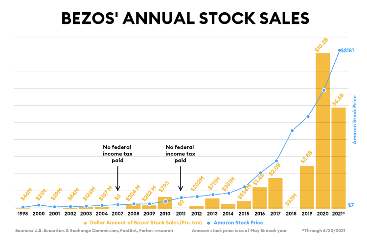 据《福布斯》计算,自亚马逊1997年上市以来,贝索斯总共出售了价值近270亿美元的亚马逊股票。自1998年以来,除了2005、2006、2007和2011年之外,贝索斯每年都出售亚马逊股票。这也解释了为什么贝索斯在2007年和2011年没有缴纳联邦所得税。(如下图)