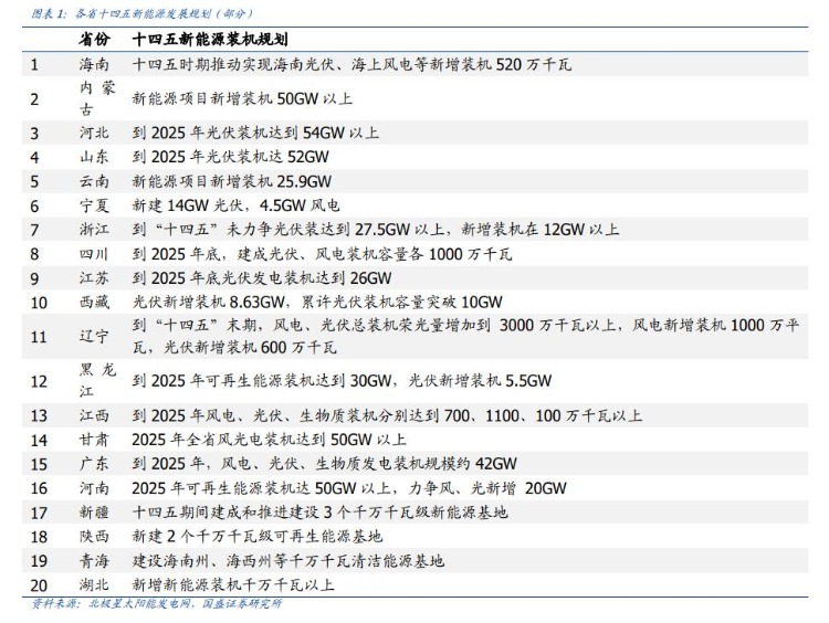 值得注意的是,自2020年以来,国内光伏、风电等新能源产业的发展就释放出足够多的积极信号,各省份制定高增长的装机目标也在情理之中,因此重点需关注光伏、风电等发展方向。从各省份公布的‘十四五’规划内容来看,大力发展可再生能源或许已经成为共识。
