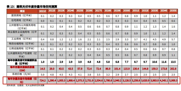光大证券认为,目前存量可改造安装光伏组件的面积约为 96.56 亿平方米。假设每平米可安装光伏组件为 150W,得出存量改造潜力 1448.4GW,市场空间 4.3 万亿元。假设存量改造分 15 年做完即 2021 至 2035 年,每年的改造比例占总改造空间的 1%到 14%,我国存量改造建筑光伏装机容量由 14.5GW 增长至 202.8GW,假设光伏系统从 5 元/W 下降到 2.5 元/W,对应市场规模由 724.4亿元增长至 5069.3 亿元。