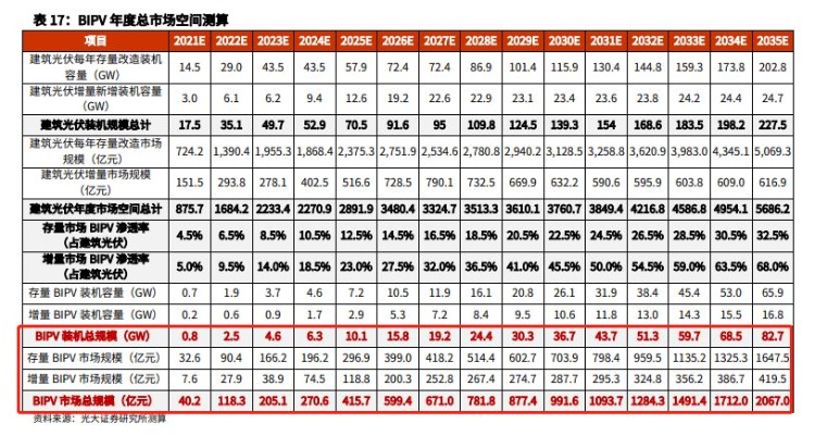未来随着绿色建筑和相应标准的确立,光大证券预计到2030年BIPV装机总容量可达36.7GW,总市场规模可达 991.6 亿元;到 2035 年 BIPV 装机总容量可达 82.7GW,总市场规模可达 2067 亿元。以 2021-2026 年 5 年时间维度看,BIPV 装机增加 20倍,CAGR-5(复合年均增长率) 为 81.59%,市场规模增加 15 倍, CAGR-5 为 71.65%。