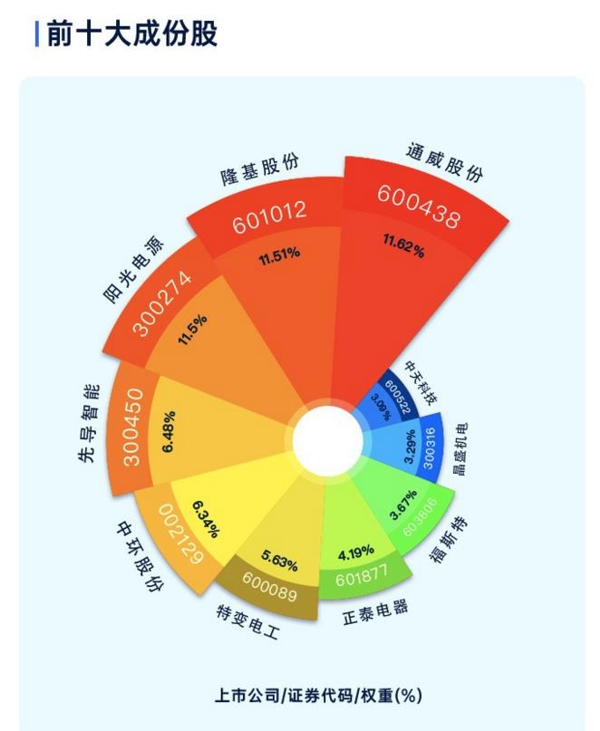 其中主要成分股包括通威股份、隆基股份、阳光电源、先导智能、中环股份等。