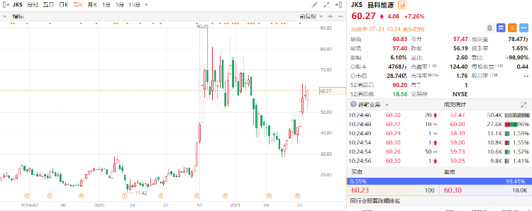 作为美股市场上光伏中概股,晶科能源股价近期表现极为强劲。从28.39元低点至今,晶科能源股价已接近翻倍。
