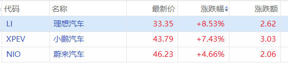 截至发稿,新能源汽车方面,理想汽车涨8.53%,小鹏汽车涨7.43%,蔚来汽车涨4.66%。