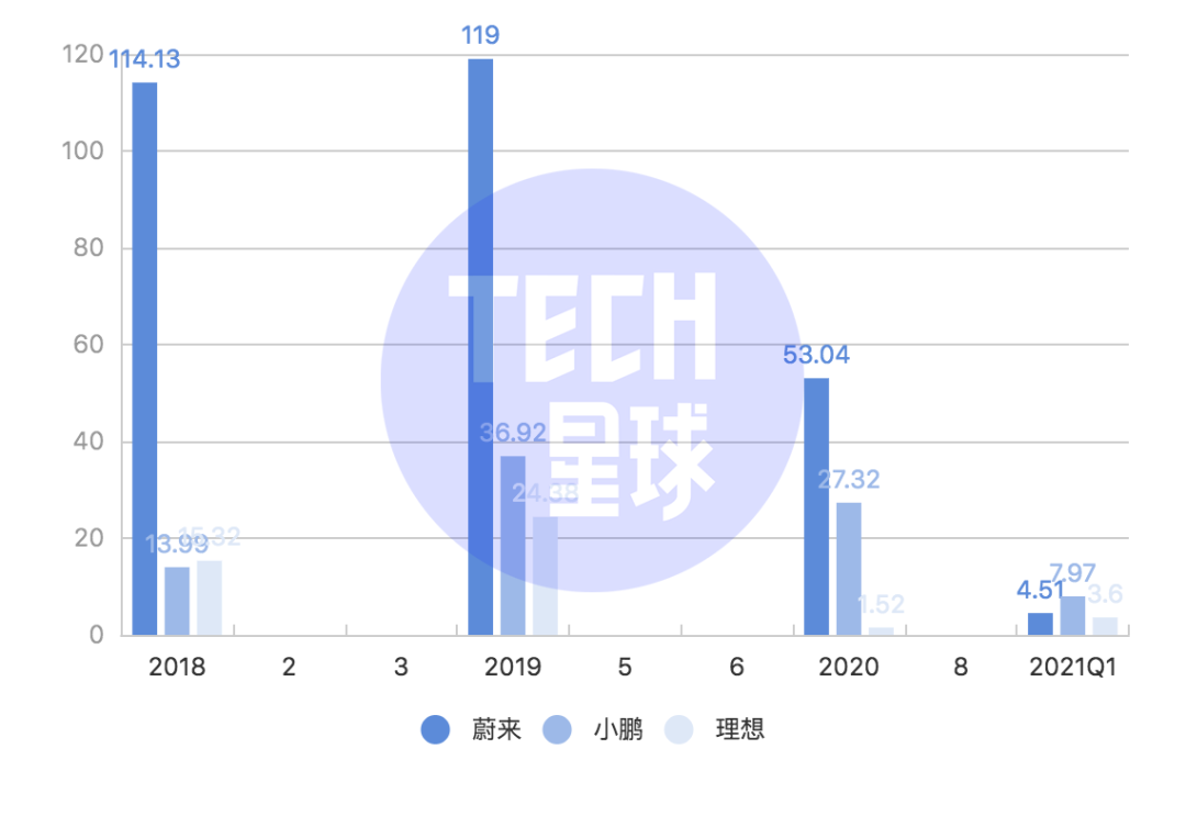 2018-2020年,蔚来净亏损分别为114.13亿元、119亿元和53.04亿元,合计286亿元,如果加上2017年净亏损50.122亿元和2018年净亏损为96.39亿元,亏损高达433亿。