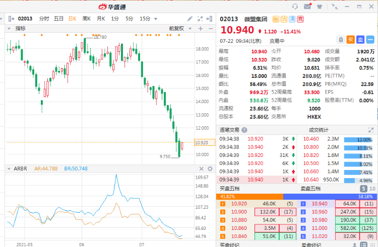 7月22日消息,微盟集团经七连跌后今日涨11.41%,报10.94港元,最新市值280亿港元。