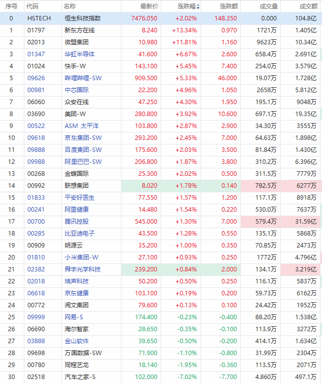 新东方在线上涨13.34%;微盟集团上涨11.81%;华虹半导体上涨6.67%;快手-W上涨5.45%;哔哩哔哩-SW上涨5.33%;中芯国际、众安在线涨超4%;美团-W上涨3.92%;ASM太平洋、京东集团-SW、百度集团-SW涨超2%。